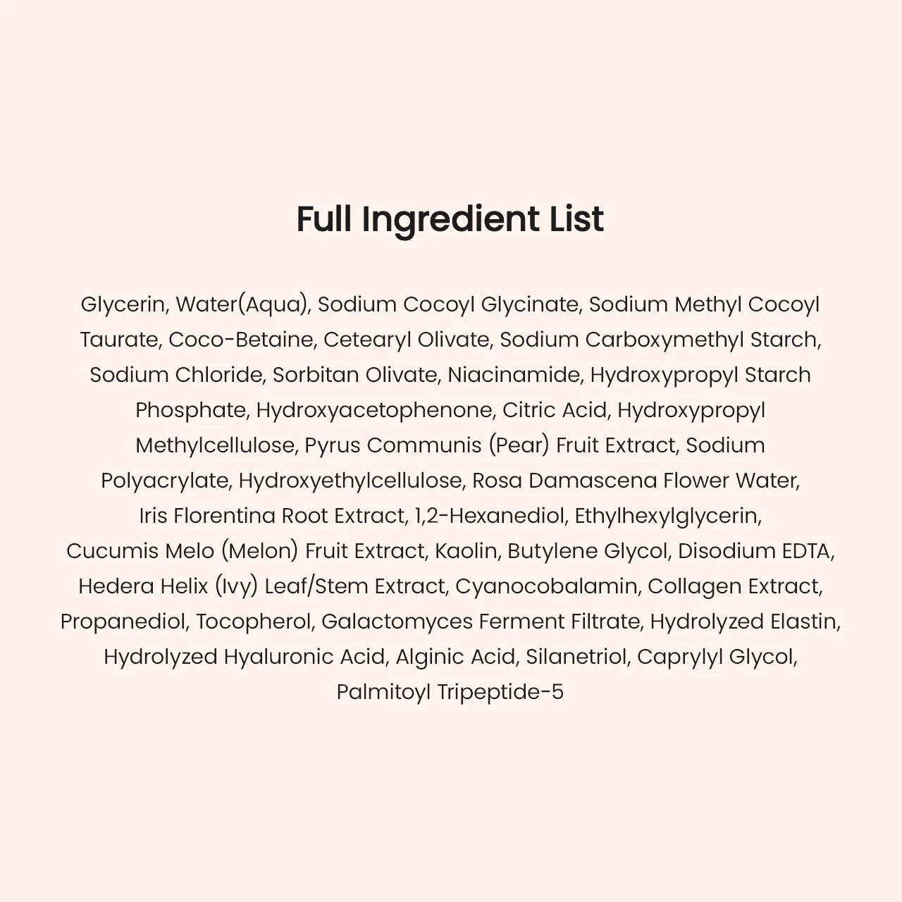 Glycerin, Water(Aqua), Sodium Cocoyl Glycinate, Sodium Methyl Cocoyl Taurate, Coco-Betaine, Cetearyl Olivate, Sodium Carboxymethyl Starch, Sodium Chloride, Sorbitan Olivate, Niacinamide, Hydroxypropyl Starch Phosphate, Hydroxyacetophenone, Citric Acid, Hydroxypropyl Methylcellulose, Pyrus Communis (Pear) Fruit Extract, Sodium Polyacrylate, Hydroxyethylcellulose, Rosa Damascena Flower Water, Iris Florentina Root Extract, 1,2-Hexanediol, Ethylhexylglycerin, Cucumis Melo (Melon) Fruit Extract, Kaolin, Butylene Glycol, Disodium EDTA, Hedera Helix (Ivy) Leaf/Stem Extract, Cyanocobalamin, Collagen Extract, Propanediol, Tocopherol, Galactomyces Ferment Filtrate, Hydrolyzed Elastin, Hydrolyzed Hyaluronic Acid, Alginic Acid, Silanetriol, Caprylyl Glycol, Palmitoyl Tripeptide-5